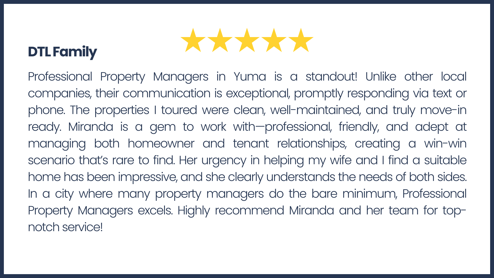 We proudly serve both homeowners and investors in Yuma, providing tailored solutions that meet the unique needs of each property. Our team is driven by a passion for excellence, and we prioritize building strong, lasting relationships with our clients through transparent, responsive service and a genuine care for their investments. Whether you're a seasoned investor or a homeowner looking for reliable management, Professional Property Managers is here to ensure your property is in expert hands.